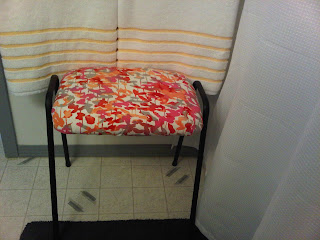 Attaching the pretty fabric was essentially the same process as attaching the white fabric (though because its a little bit "silkier" it did cause some difficulties, and I also had to make sure that the pattern was lined up properly). But, all in all, I managed. And when Billy's seat was fully dressed up, all I had to do was attach the newly painted legs to the seat and set him up!